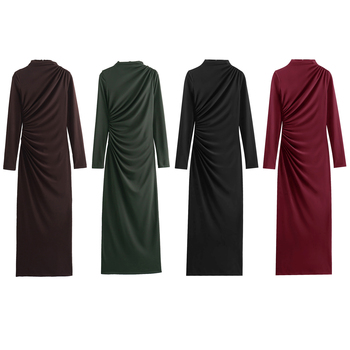 Vestido Largo Casual de Moda para Mujer, Cuello Alto, Manga Larga, Plisado, Color Sólido, 4 Colores Disponibles